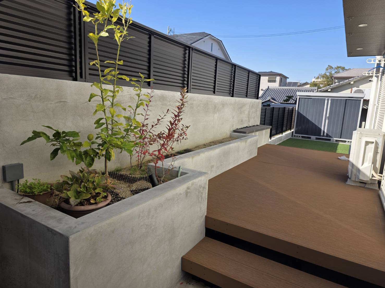 黒い横格子フェンスも空間を引き締める役割を果たし、都会的でスタイリッシュな印象を維持しています。