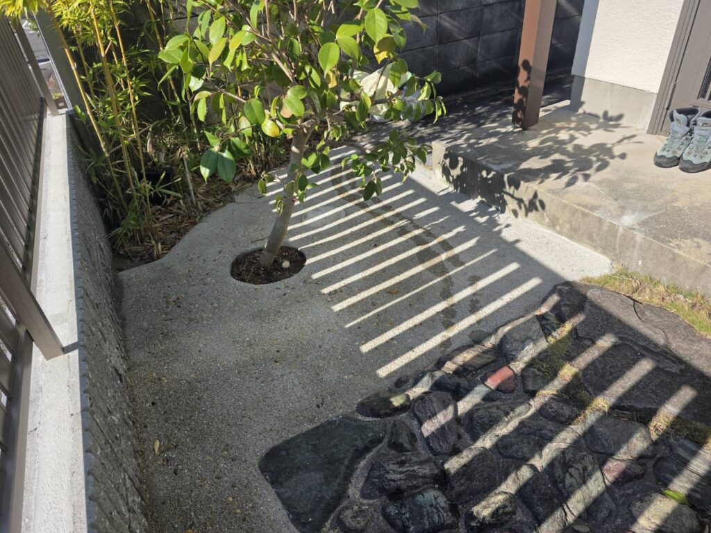 完成後の写真では、シンボルツリーを囲むようにコンクリートが美しく仕上げられているのが確認できます。