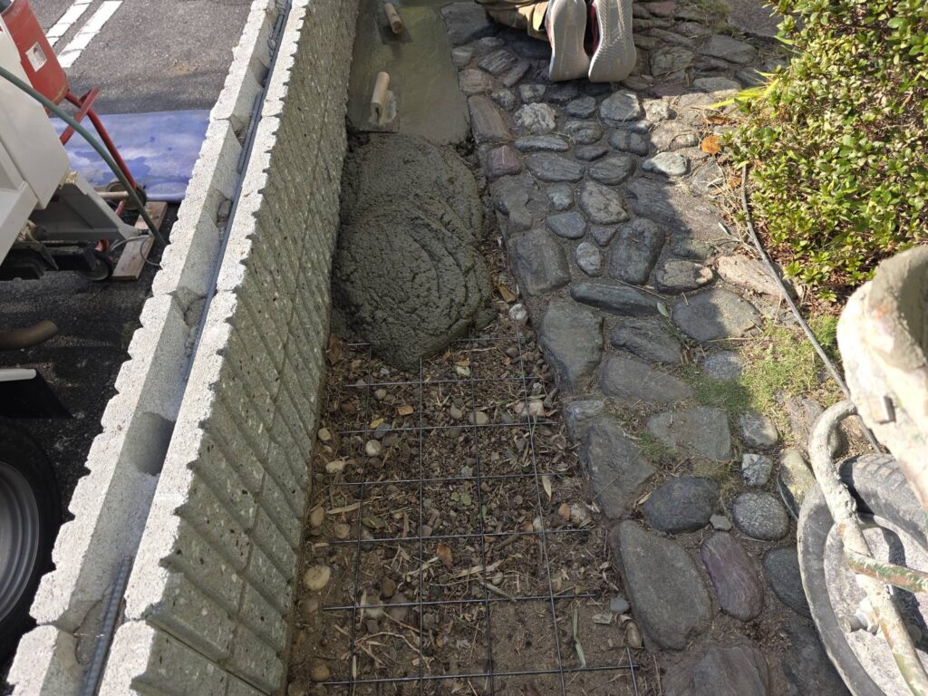 石積みを撤去した後は、新しいブロック塀の基礎となるコンクリートを打設します。
