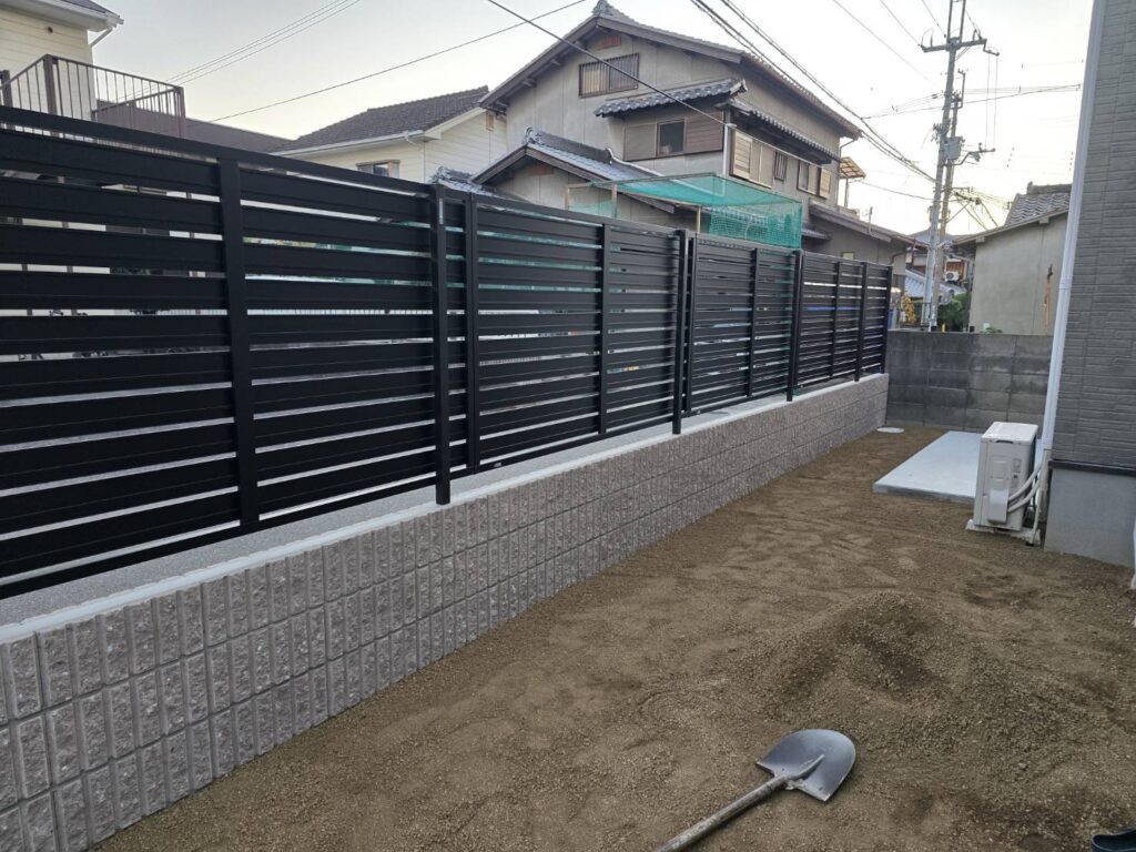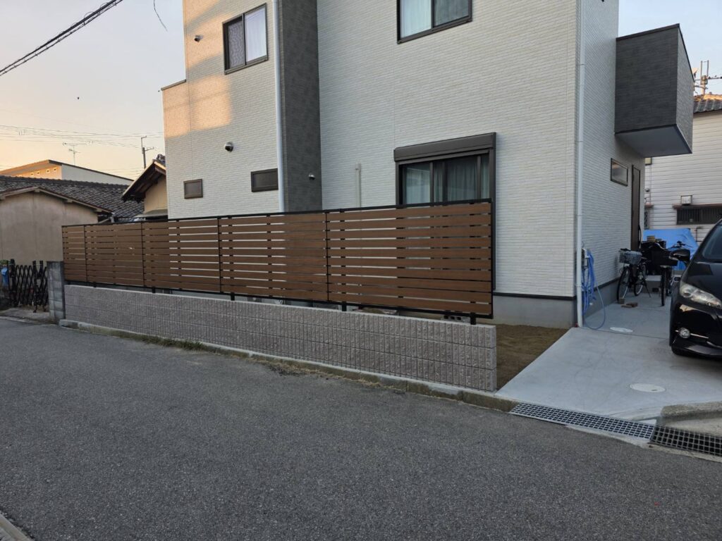 大阪府和泉市A様邸の外構リフォーム工事では、既存のブロック塀を撤去し、モダンな目隠しフェンスと印象的な門柱を設置いたしました。