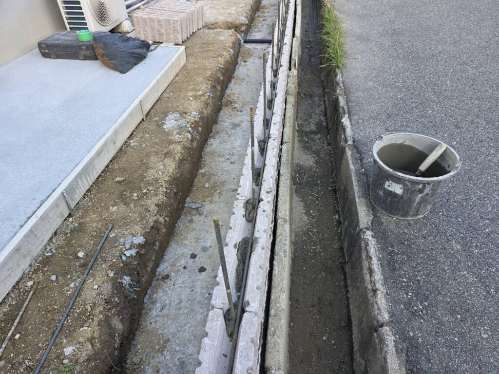 フェンスの支柱は、新たに施工したブロック基礎にしっかりと固定されています。